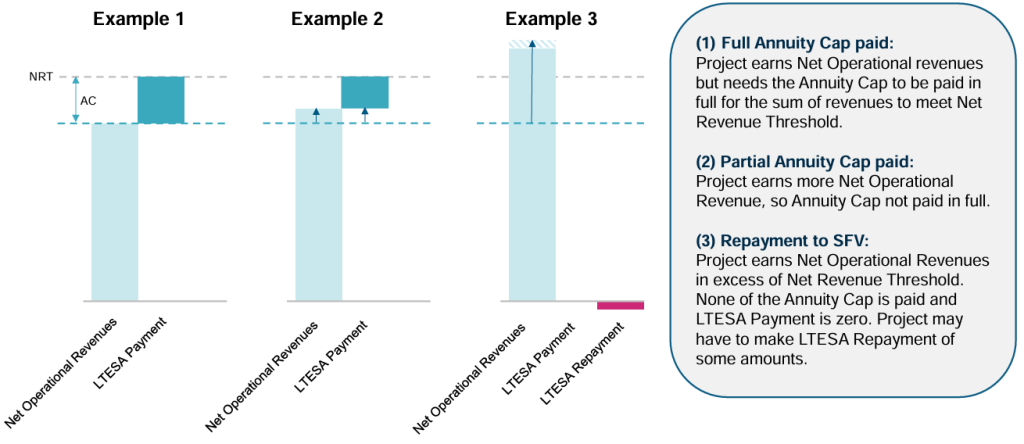 - Low Annuity Cap: The Annuity Cap is the key pricing variable, and a competitively bid Annuity Cap minimises both Net LTESA Cost and Maximum Liability. Successful proponents set their Annuity Caps below their Net Revenue Thresholds, indicating they are accepting some market revenue risk and not relying on the LTESA to fully cover their investment costs.